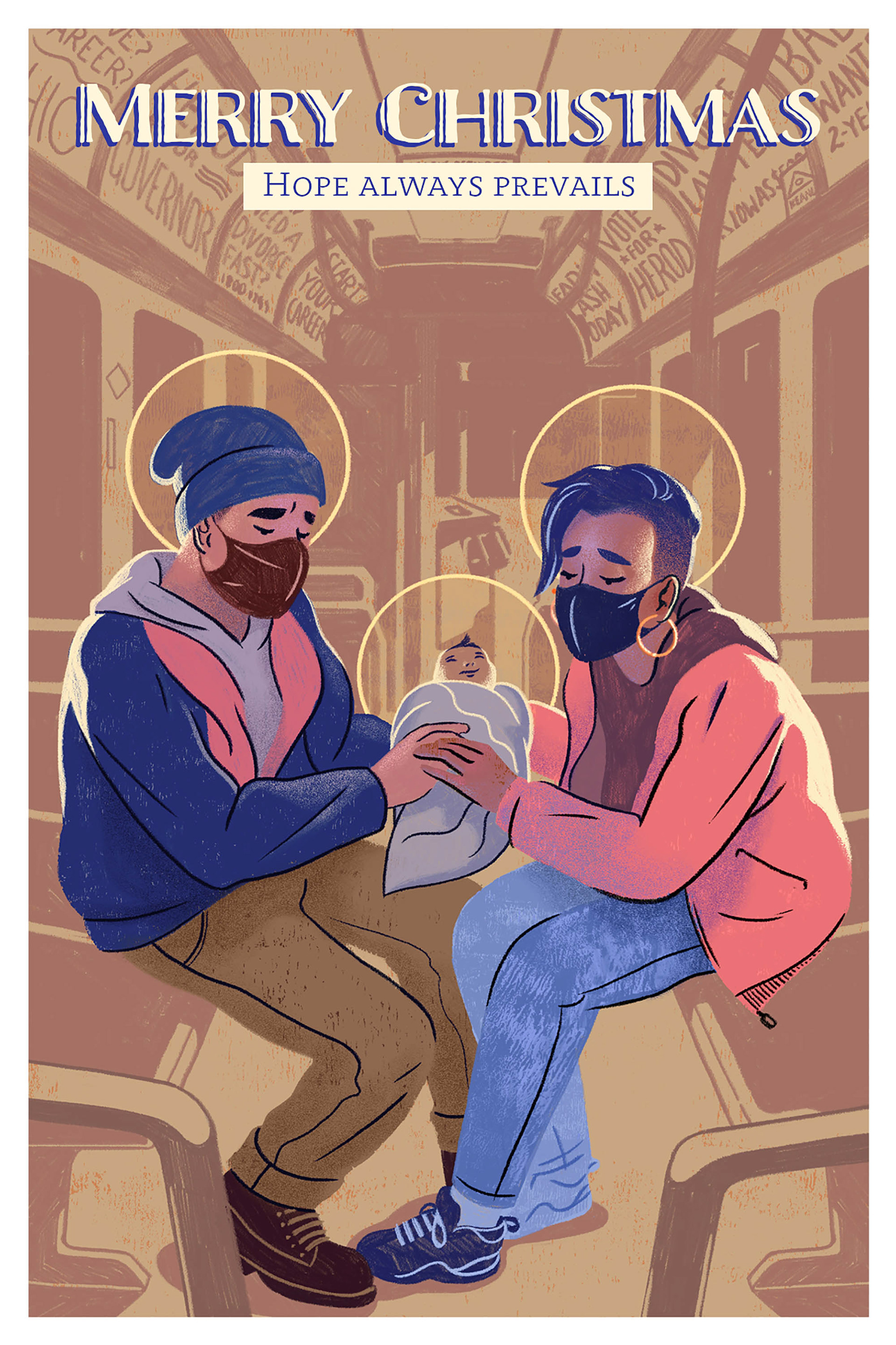 I created this illustration design to print as a Christmas card this year. I wanted to depict a contemporary nativity scene, and chose a modern day MTA / NYC bus as my environment. Joseph and Mary are two young adults holding infant Jesus in their arms. Below are shots of the final print which are currently available for sale on Etsy.